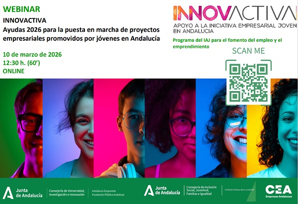La Consejería de Inclusión Social, Juventud, Familias e Igualdad publica la Resolución de 23 de febrero de 2026, de la Dirección General del Instituto Andaluz de la Juventud, por la que se convocan subvenciones, en régimen de concurrencia competitiva, a personas jóvenes andaluzas o residentes en Andalucía, para poner en funcionamiento proyectos empresariales en Andalucía (programa «Innovactiva»), para el ejercicio 2026.