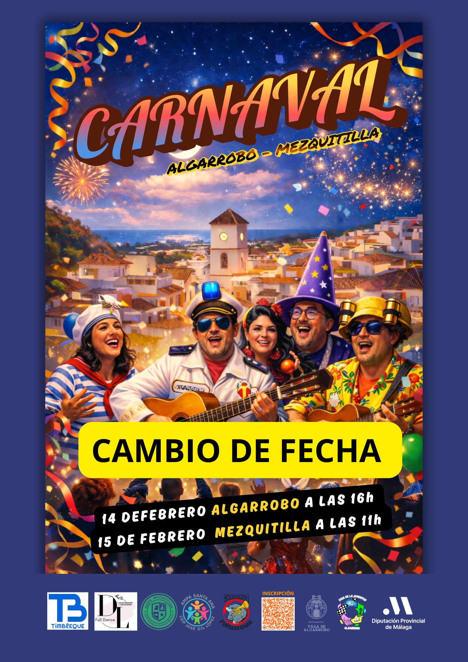 El Ayuntamiento de Algarrobo informa del cambio de fecha del Carnaval de Algarrobo y Mezquitilla debido a las previsiones climatológicas y a la situación actual en Andalucía, con el fin de garantizar la seguridad y el correcto desarrollo de las actividades.