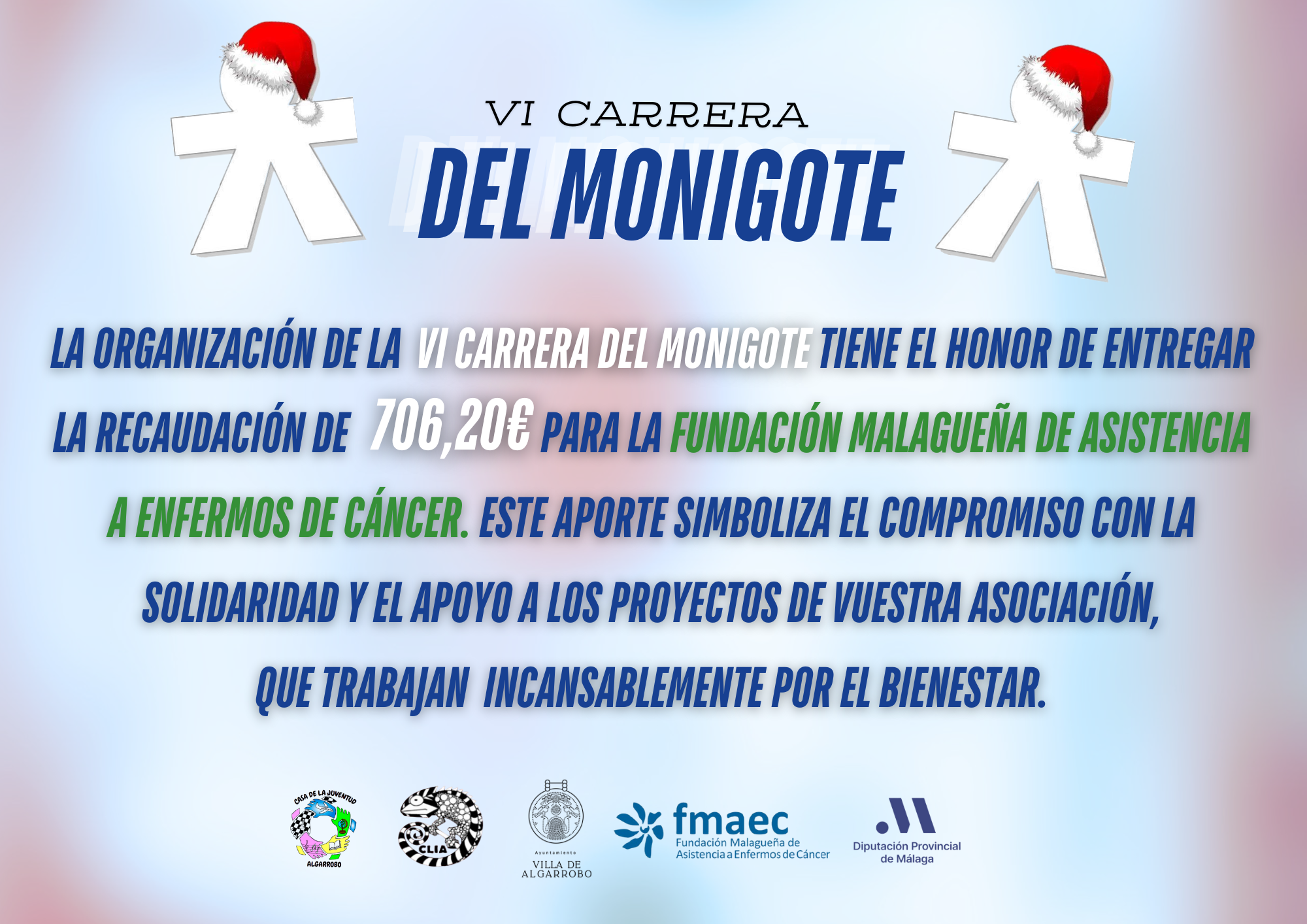 La organización de la carrera ha tenido el honor de hacer entrega de la cantidad de 706,20 € a la Fundación Malagueña de Asistencia a Enfermos de Cáncer (FMAC). Este gesto simboliza el compromiso con la solidaridad, el apoyo y el respaldo a los proyectos de la fundación, que trabajan incansablemente por el bienestar de las personas afectadas y sus familias. ¡Gracias a todas las personas que han hecho posible esta iniciativa solidaria!