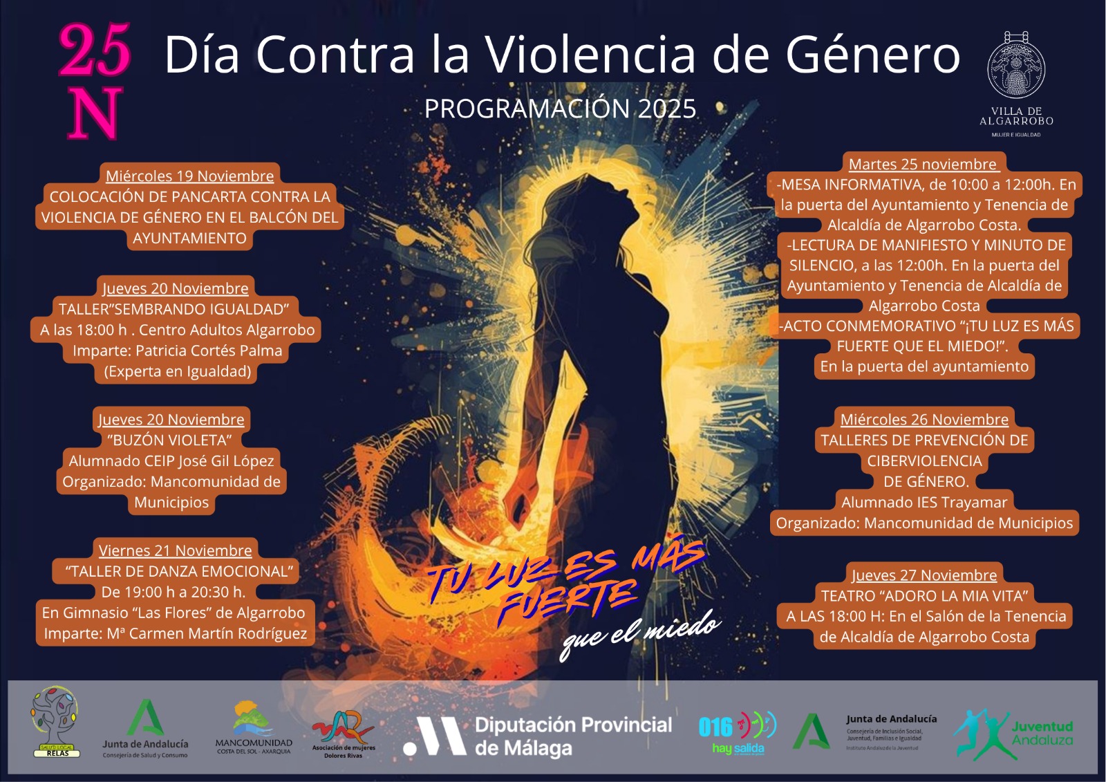 El Ayuntamiento de Algarrobo, a través de la Concejalía de Mujer e Igualdad, ha presentado la programación de actividades con motivo del Día Internacional contra la Violencia de Género, que se conmemora el 25 de noviembre. Bajo el lema “Tu luz es más fuerte que el miedo”, el municipio desarrollará una completa agenda de acciones de sensibilización, prevención y participación ciudadana del 19 al 27 de noviembre.
